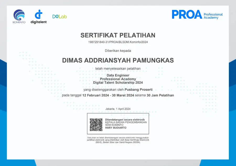 Saya antusias dan selalu bersemangat untuk terus belajar serta mengembangkan kemampuan di lingkungan kerja yang dinamis, khususnya sebagai Data Engineer, Data Analyst, ataupun ETL Developer. Ketertarikan saya pada analisis data dan teknologi modern mendorong saya untuk terus mencari cara baru dalam menyederhanakan dan menyempurnakan proses data.
