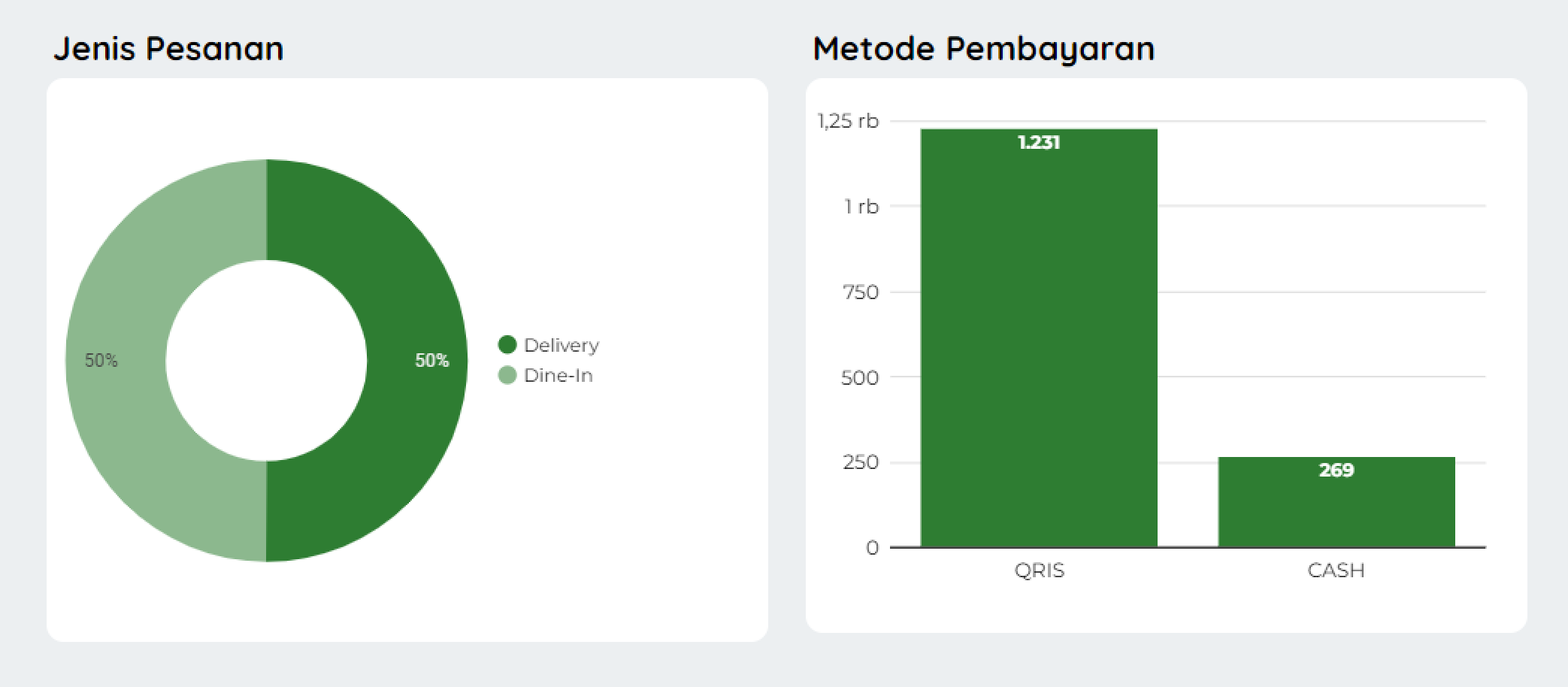 Mengidentifikasi distribusi berbagai jenis pesanan dalam total penjualan. Metrik ini memberikan gambaran tentang produk mana yang paling diminati dan bagaimana menu bisa disesuaikan untuk memenuhi permintaan pelanggan.