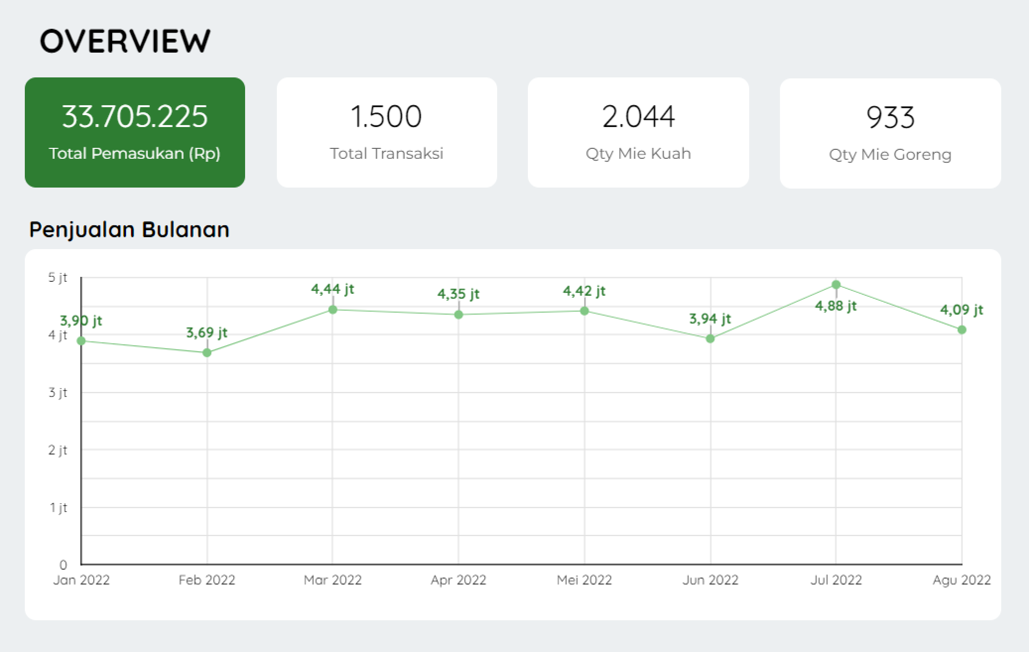 Pada laporan penjualan Warmindo periode January 2022 - Agustus 2022, total pemasukan mencapai Rp 33.705.225 dengan jumlah transaksi sebanyak 1.500. Penjualan mie goreng mendominasi dengan 2.044 porsi terjual,sementara mie kuah mencatat penjualan sebanyak 933 porsi. Data ini menunjukkan preferensi pelanggan yang kuat terhadap mie goreng dan menggambarkan potensi area untuk meningkatkan penjualan mie kuah.
