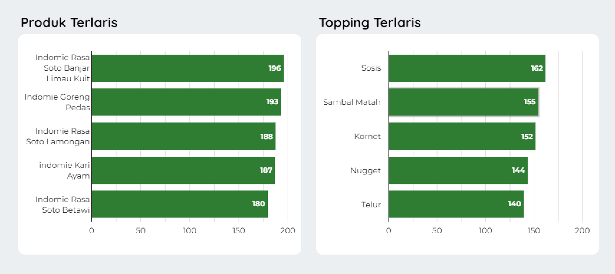 Data menunjukkan produk dan topping yang paling populer di kalangan pelanggan. Berdasarkan informasi ini, pemilik Warmindo dapat mempertimbangkan untuk menambah variasi produk atau topping serupa dan mempromosikan item-item ini lebih intensif. Selain itu, pengembangan paket penjualan berdasarkan menu favorit ini dapat meningkatkan daya tarik dan penjualan.