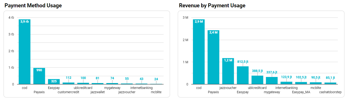 Menganalisis metode pembayaran yang paling sering digunakan seperti tunai, kartu kredit, atau dompet digital. Informasi ini membantu memahami preferensi pembayaran pelanggan dan meningkatkan pengalaman bertransaksi.